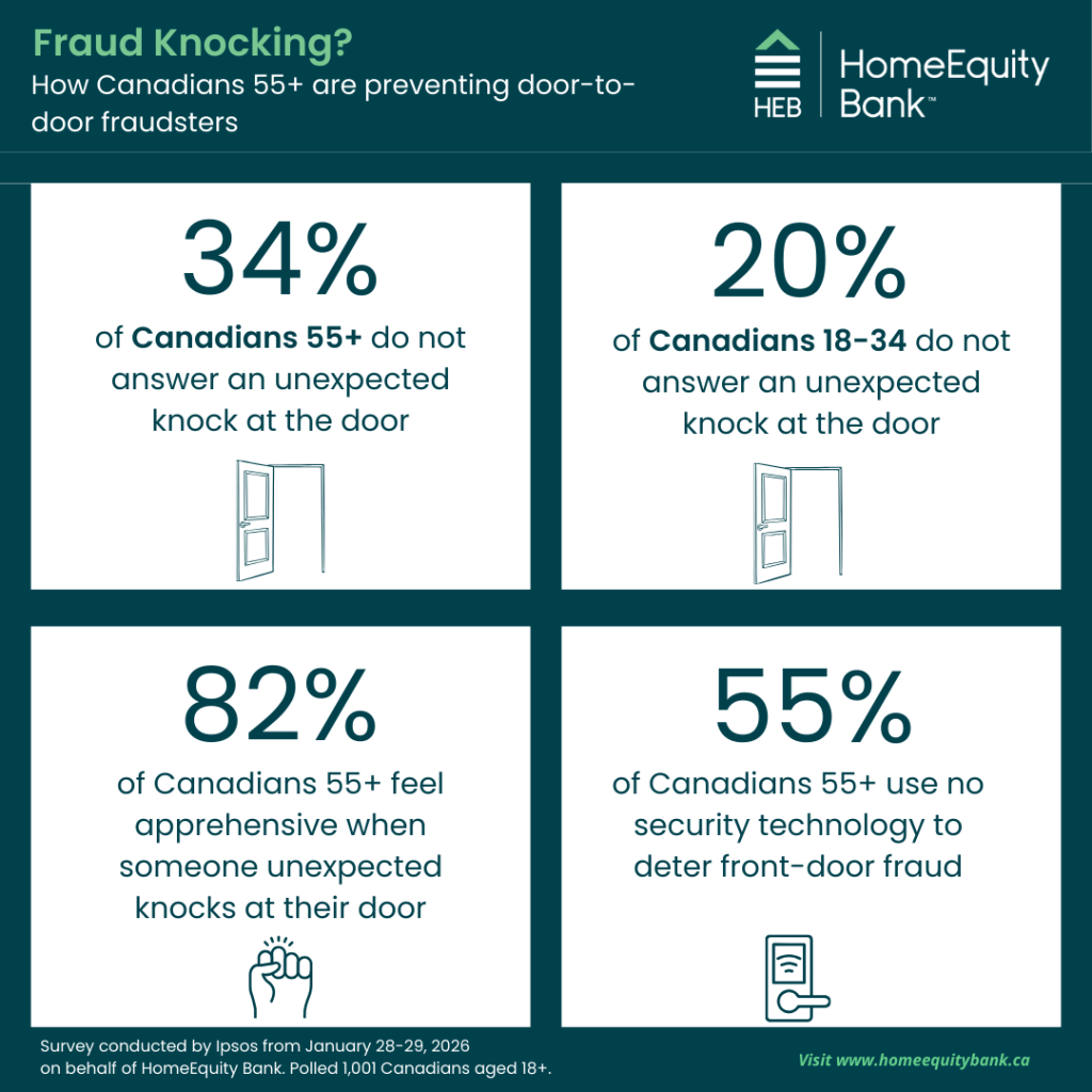 TORONTO, ON – March 2, 2026 – While popular culture claims younger generations invented ignoring a knock on the door, a new national survey reveals that older Canadians are actually far more likely to screen unknown would-be visitors. The Ipsos research, commissioned by HomeEquity Bank, found that more than one-third (34%) of Canadians aged 55+ will not answer their door to an unexpected caller, a rate 70 per cent higher than among younger adults aged 18-34 (20%).